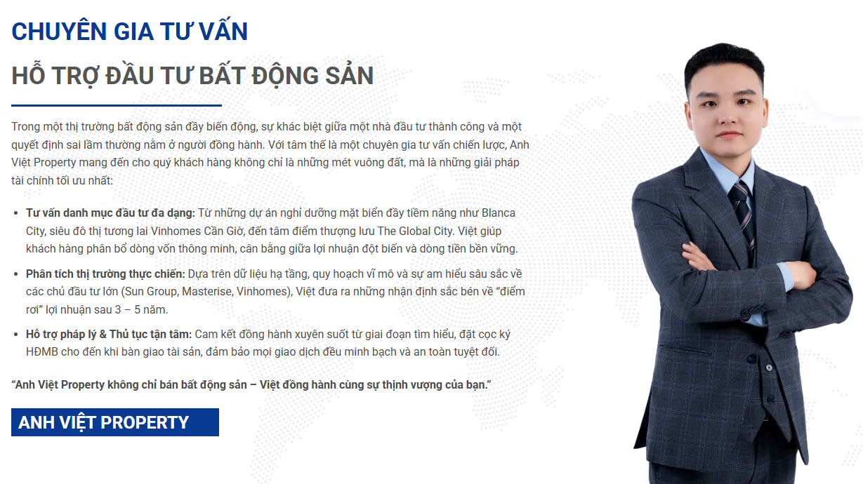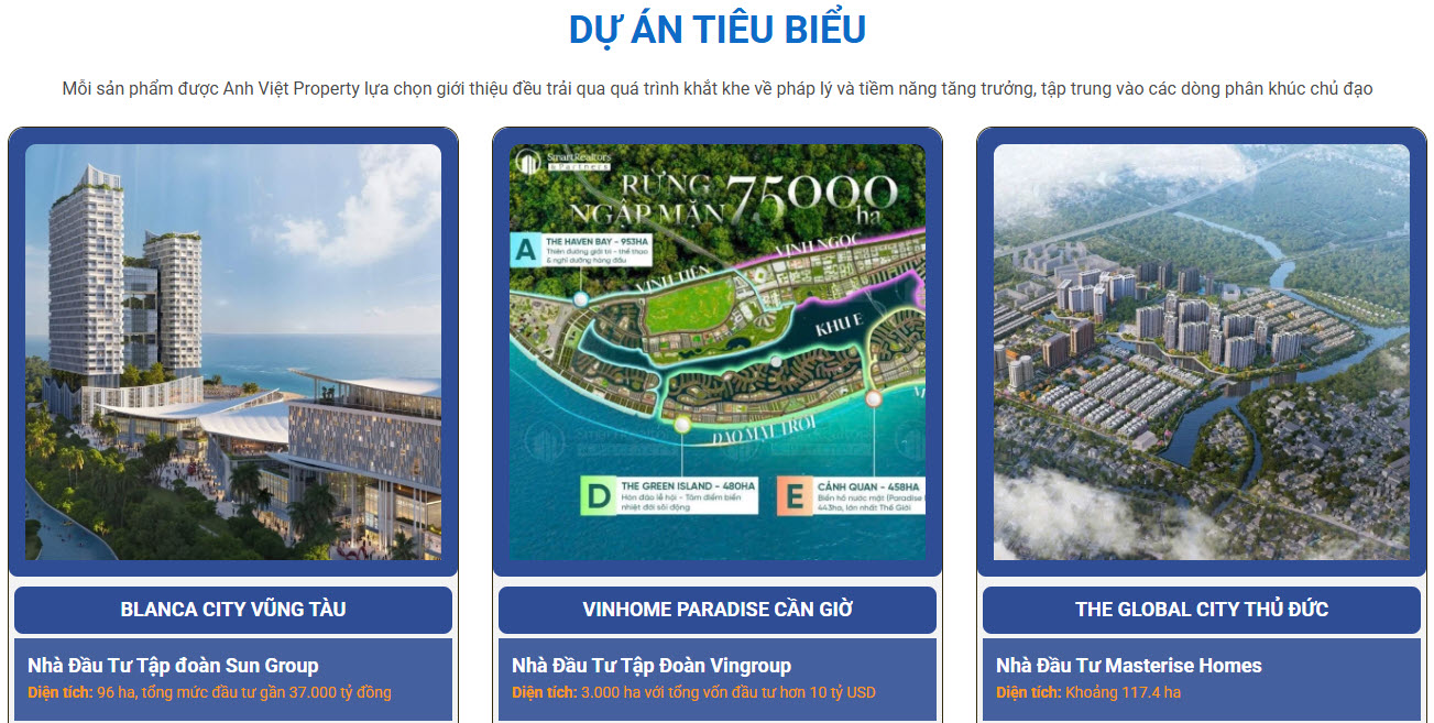 Anh Việt Property đã lựa chọn và tư vấn cho nhiều dự án nổi bật, mỗi dự án đều được đánh giá kỹ lưỡng về pháp lý và tiềm năng tăng trưởng. Điều này không chỉ giúp nhà đầu tư tiếp cận cơ hội mà còn đảm bảo sự an toàn trong mọi quyết định, với trọng tâm là các phân khúc chủ đạo như nghỉ dưỡng và đô thị hiện đại. Từ Blanca City đến The Global City, mỗi dự án đều thể hiện sự kết hợp hoàn hảo giữa vị trí chiến lược và đầu tư lớn.