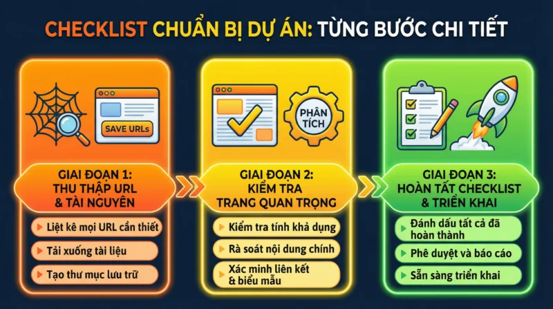 Quy trình chuẩn bị chi tiết, trực quan với checklist được minh họa bằng infographic đầy màu sắc. Mỗi bước được thể hiện rõ ràng bằng biểu tượng, giúp bạn dễ dàng theo dõi và thực hiện.