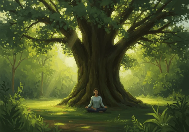 Giữa thiên nhiên thanh tịnh, tìm thấy sự bình yên nội tại dưới bóng cây cổ thụ. Ánh vàng dịu nhẹ soi đường cho hành trình vun trồng hạnh phúc từ sâu thẳm tâm hồn.