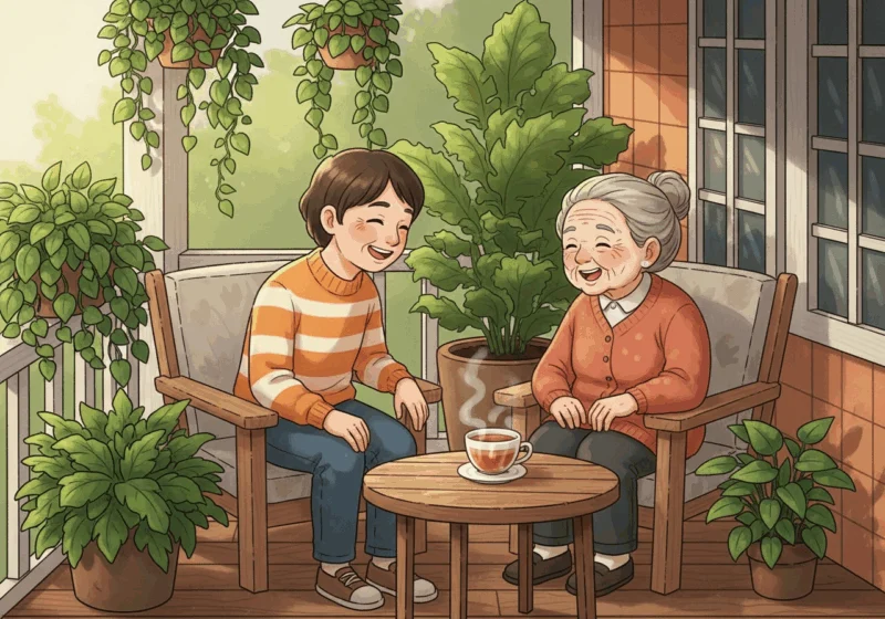 Nụ cười chân thành bên hiên nhà ấm áp, nơi tình thân và những khoảnh khắc giản dị đong đầy yêu thương. Niềm vui bình dị từ những kết nối yêu thương, được tô điểm bởi tách trà nóng và sắc xanh cây lá.