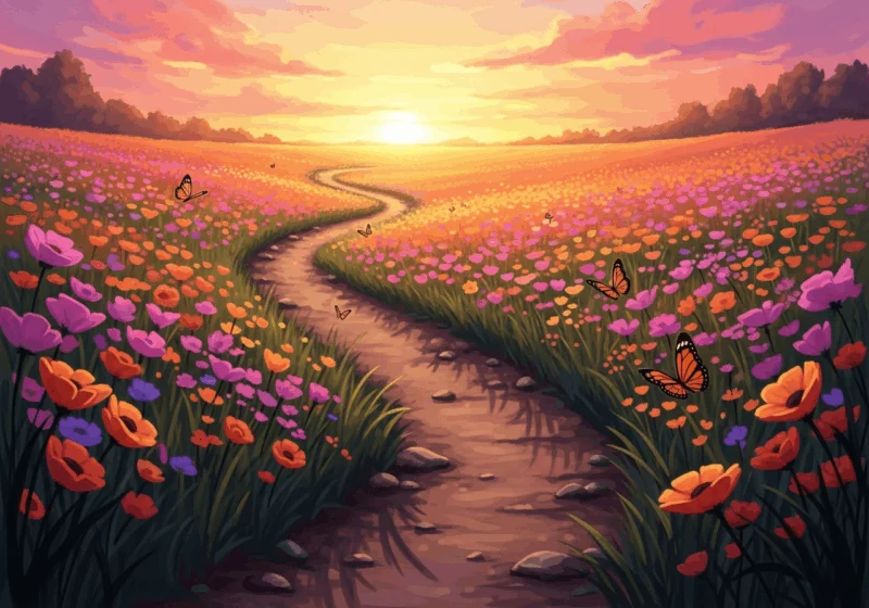 Con đường hạnh phúc là một cuộc phiêu lưu đầy màu sắc, uốn lượn qua cánh đồng hoa rực rỡ dưới ánh hoàng hôn lãng mạn.