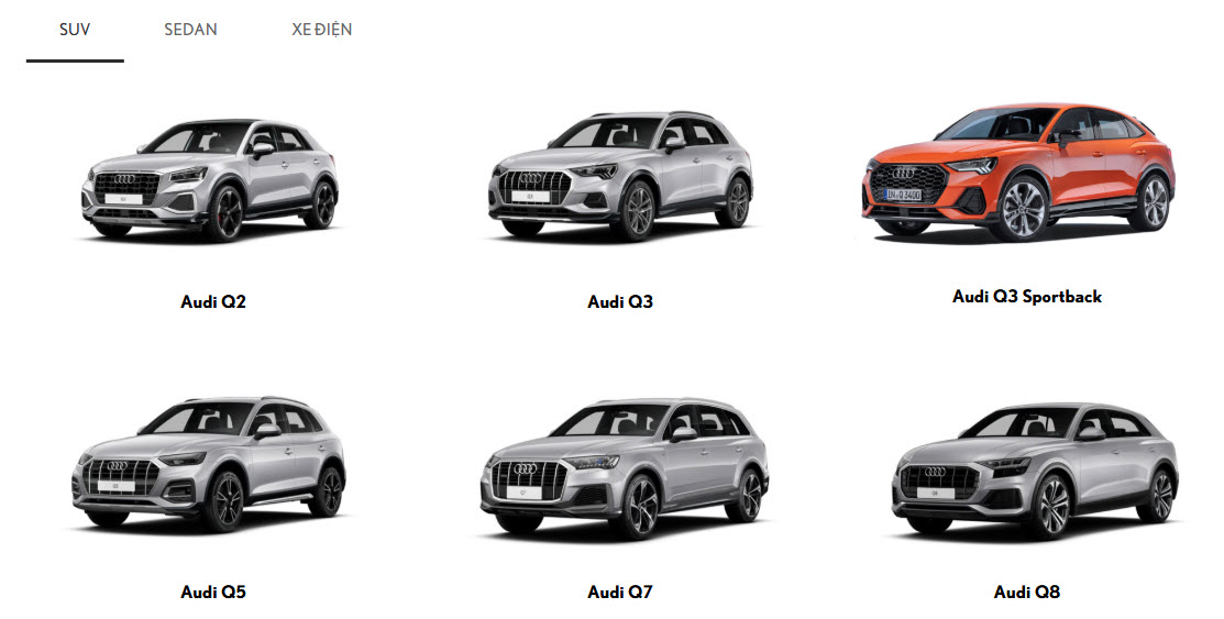 Audi Q5, Q7, và Q8 mang lại những trải nghiệm mới mẻ cho người dùng. Nhờ vào thiết kế phong cách và khả năng off-road mạnh mẽ, các mẫu SUV này trở thành sự lựa chọn hoàn hảo cho những chuyến đi dài ngày hay những hành trình khám phá.