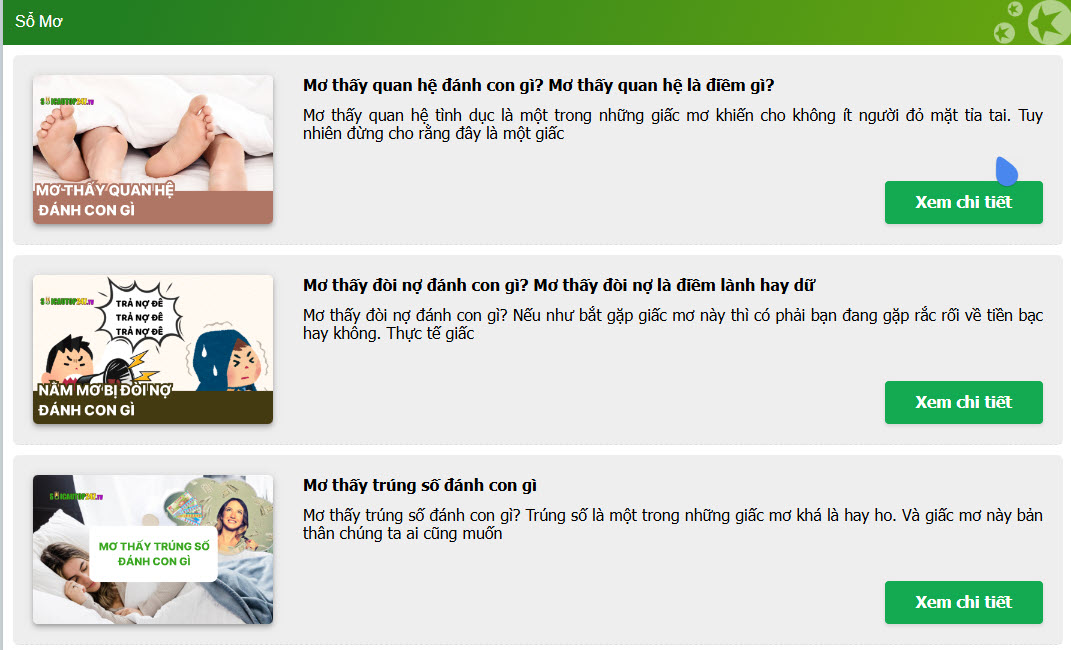 Trang web cung cấp thông tin chi tiết về các giấc mơ phổ biến và các con số tương ứng với chúng. Người chơi có thể tham khảo các bài viết, tìm hiểu về ý nghĩa của những giấc mơ mà họ gặp phải, sau đó áp dụng vào việc đặt cược. Cùng với lý luận khoa học và phân tích dữ liệu, việc giải mã giấc mơ tạo ra một khía cạnh mới mẻ trong hành trình soi cầu của người chơi.