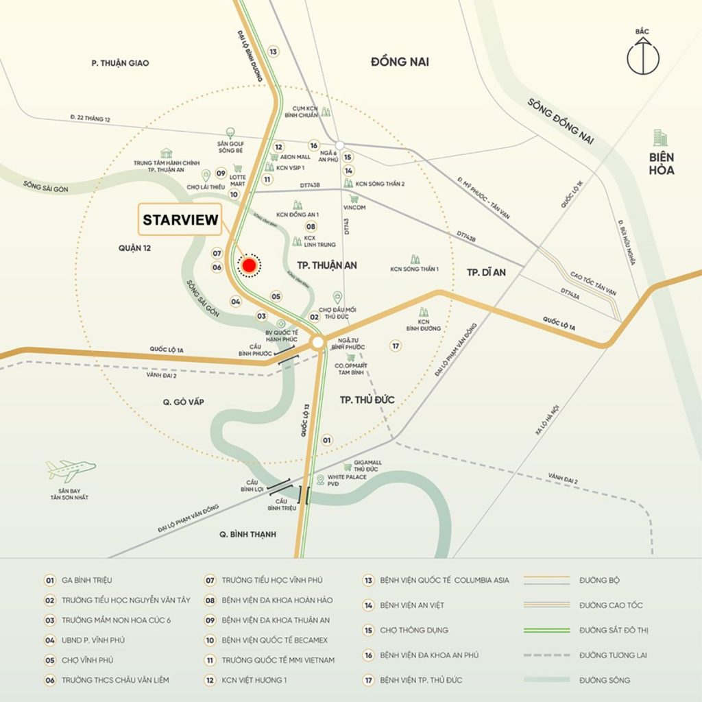 Starview Saigon sở hữu vị trí vàng ngay mặt tiền Quốc lộ 13 (Đại lộ Bình Dương), thuộc phường Vĩnh Phú, TP. Thuận An, tỉnh Bình Dương – khu vực đang chuyển mình mạnh mẽ thành trung tâm đô thị mới. Vị trí này không chỉ mang lại lợi thế giao thông thuận tiện mà còn tận dụng tối đa sự phát triển hạ tầng khu Đông – Bắc, nơi Bình Dương được xem là thủ phủ công nghiệp với dòng người lao động và chuyên gia đổ về ngày càng đông đúc.